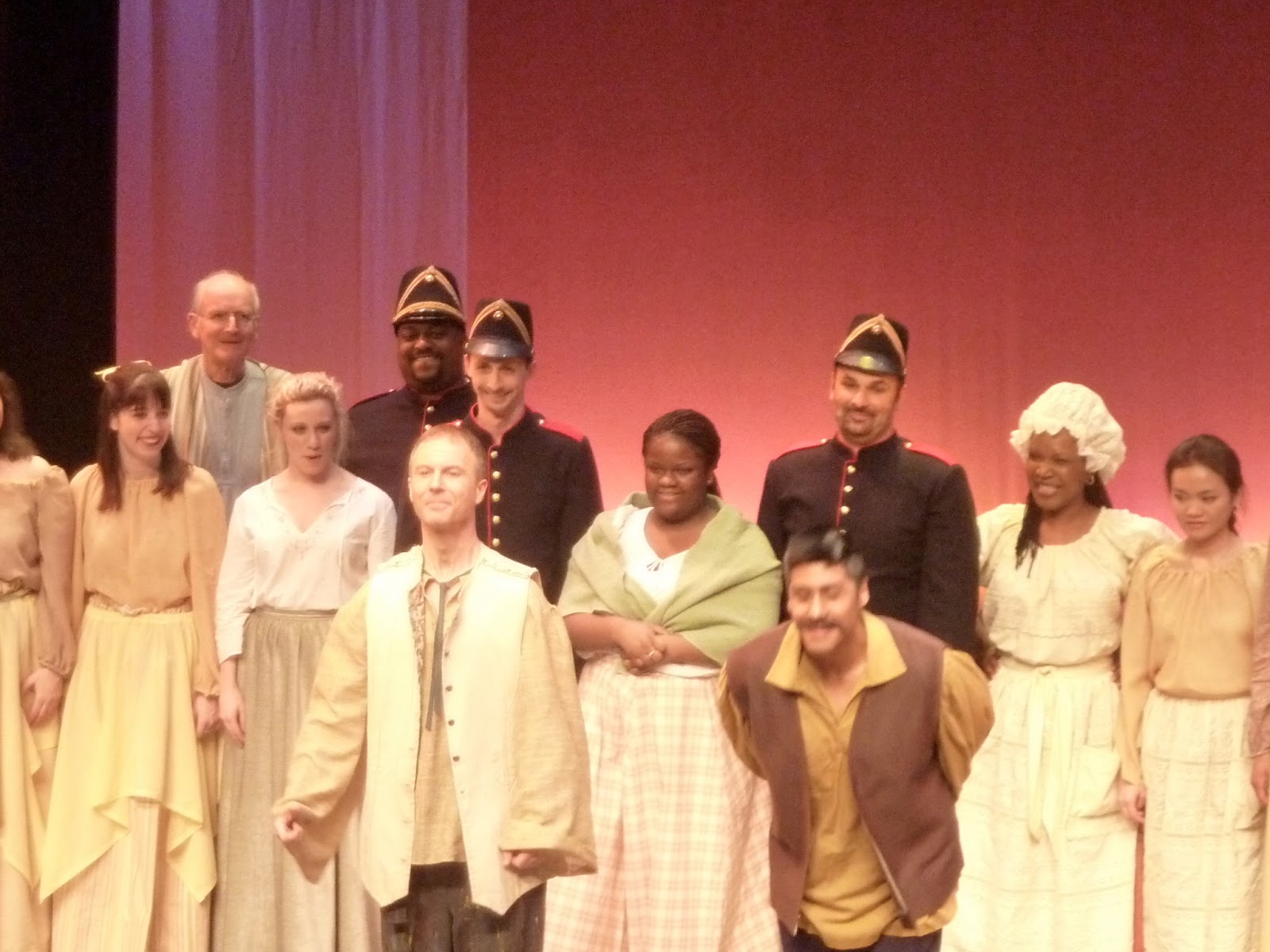 Beyond the famous overture, there's a great deal to enjoy in Rossini's whimsical score. In addition to fanfares and dance rhythms aplenty, there's an effective, dark-hued trial ensemble in which the chorus bemoans the miscarriage of justice. Its chief miscarrier, the podesta, gets some strikingly elegant music, including a good trio for him, Ninetta, and her father (who is disguised as a tramp at the time; it's a long story.) The trousered mezzo and the soprano get a rather lovely duet, and the inimitably Rossinian finale contains a very nice quintet. The orchestra, under Michael C. Haigler, gave a creditable and energetic performance, despite some imprecision. The staging was kept simple, with furniture moved around in different combinations to suggest various locations, and sheets of cloth in black and white recalling the magpie's plumage. The performance was given in English, which clearly worked well for the audience's engagement, despite the sometimes odd cadences of text, and occasional howlers. (Parenthetically, I must express admiration for any singer negotiating Rossinian patter and English consonants at the same time.)