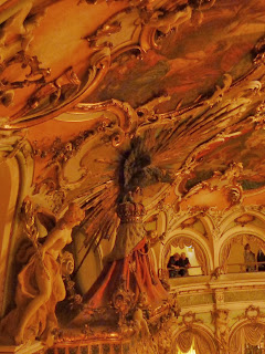 Here are the ceiling painting and chandelier as seen from my seat in the second tier: